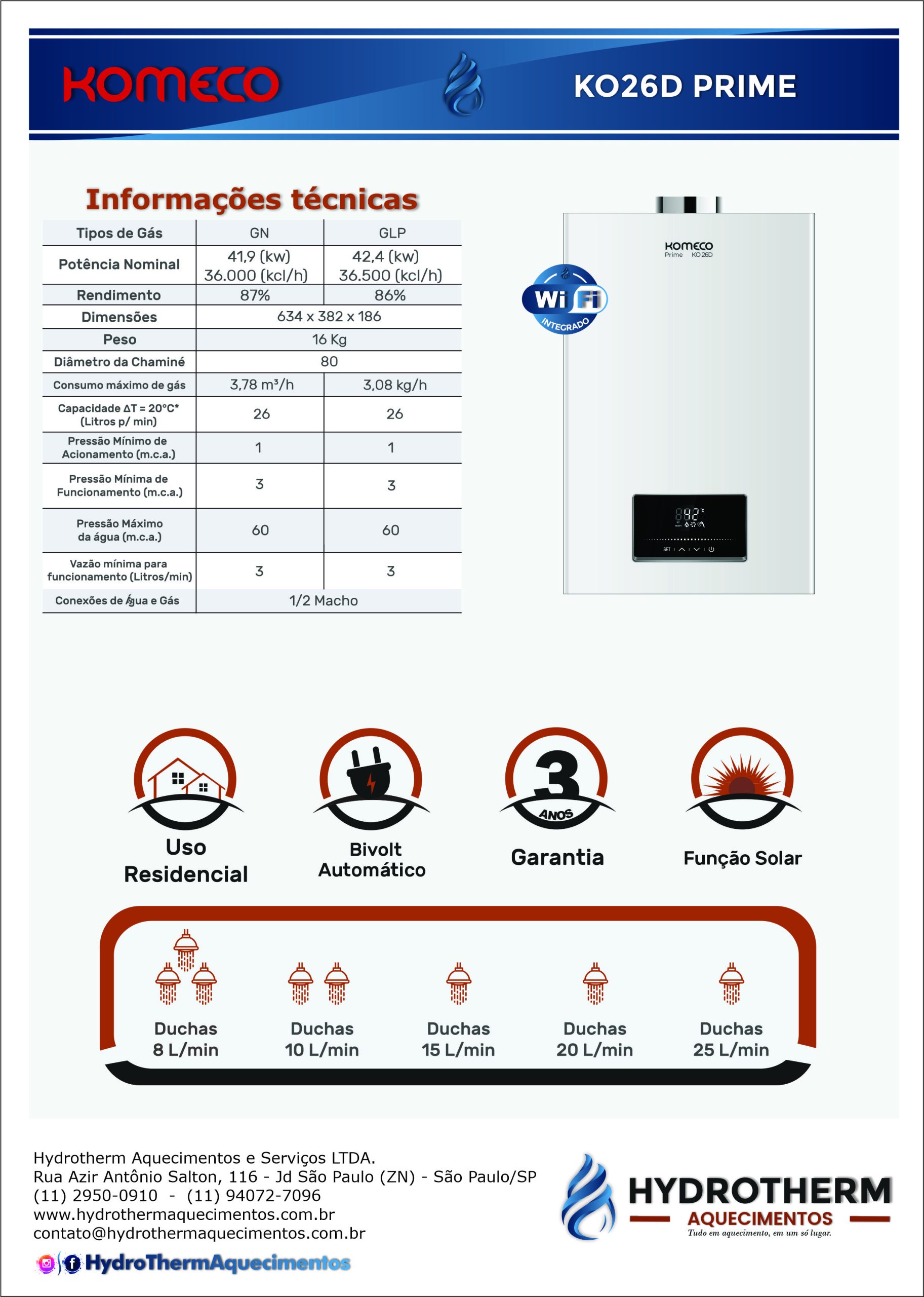 • Capacidade: Atende até 3 duchas, garantindo água quente em abundância para toda a família.