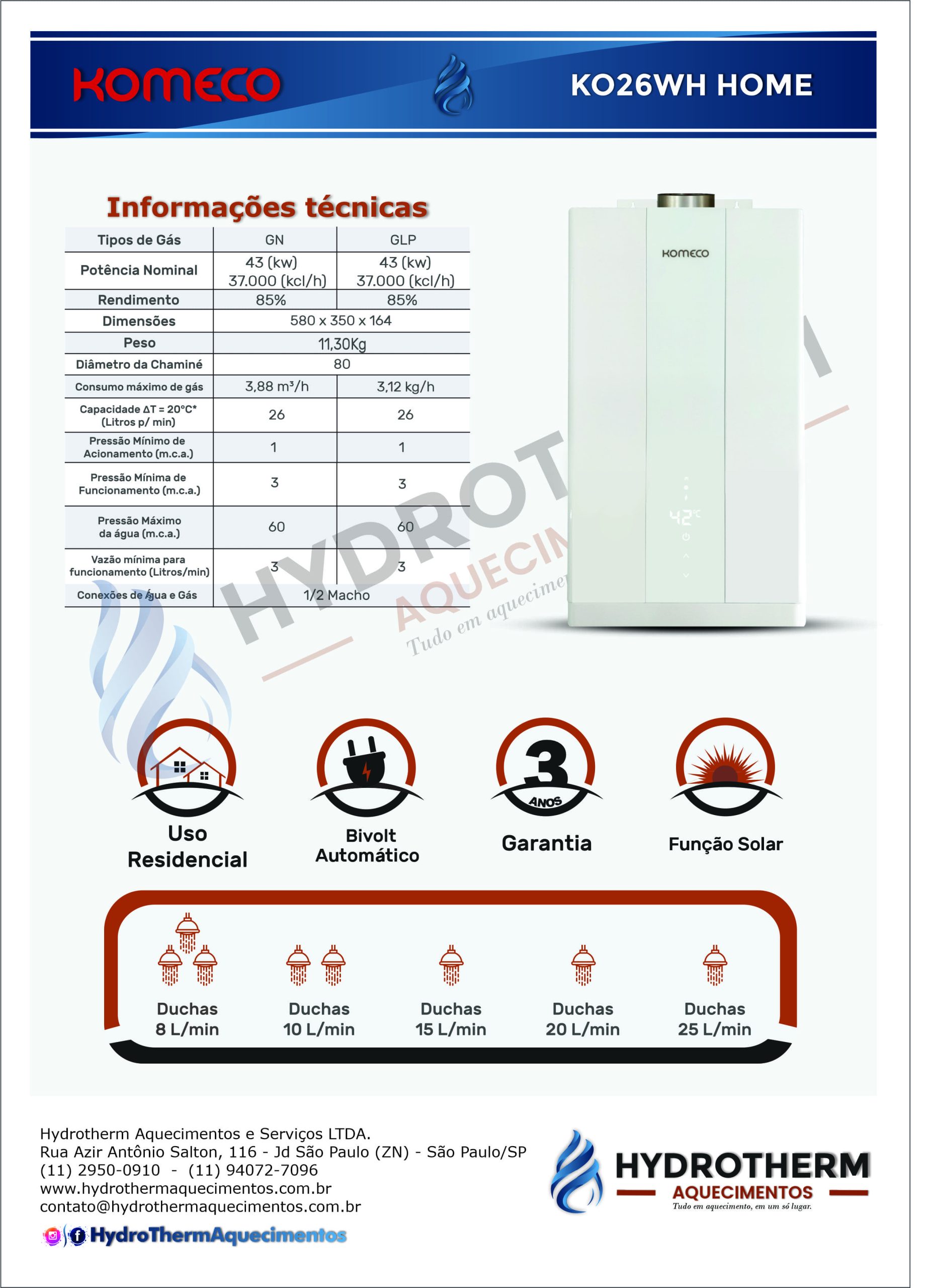 • Capacidade: Atende até 3 duchas simultâneas, ideal para famílias maiores e uso intenso.