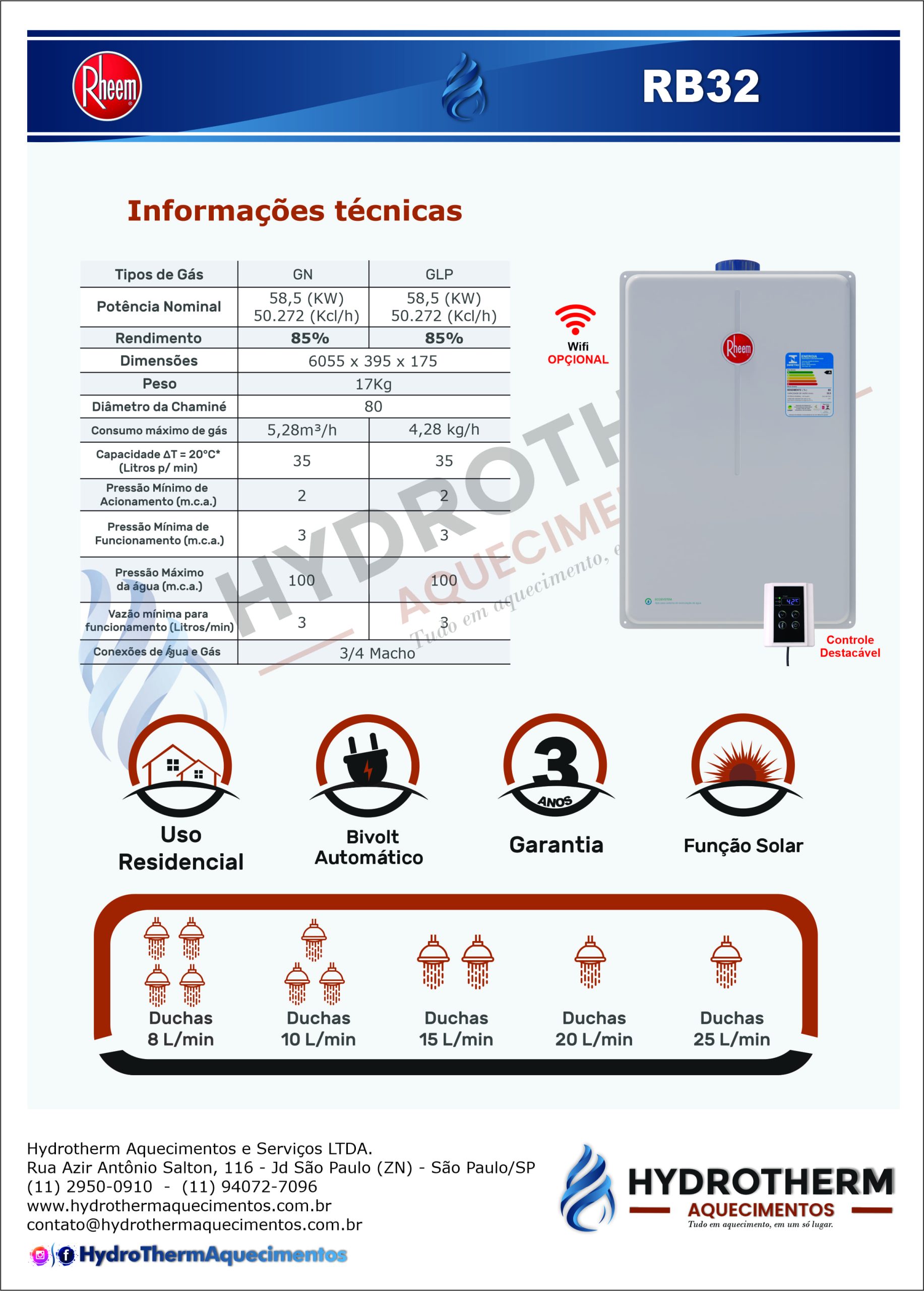 • Capacidade: Ideal para grandes residências, suportando múltiplos banhos sem oscilação de temperatura.